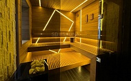 Полок Абаш. Преимущество полка из африканского дуба заключается в низкой теплопроводности, благодаря этому свойству обжечься в режиме финской сауны практически не возможно